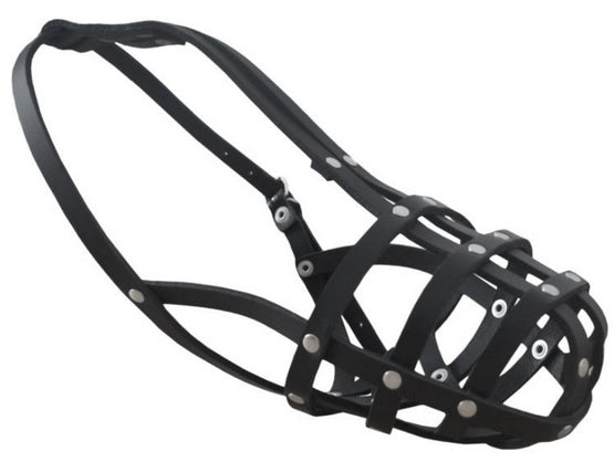 Solidny i wytrzymały kaganiec wykonany ze skóry naturalnej, łączonej stalowymi nitami.
