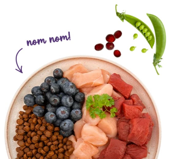główne źródła białka: świeże mięso z kurczaka i suszone białko strusia